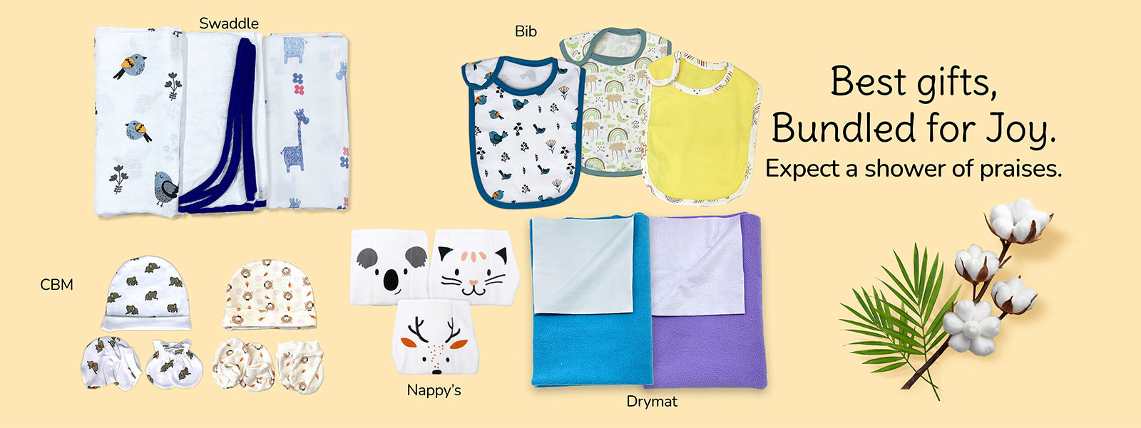 Newborn Baby Gifts Set Pack of 17 - Swaddles + CBM + Nappies + Drymats + Bibs