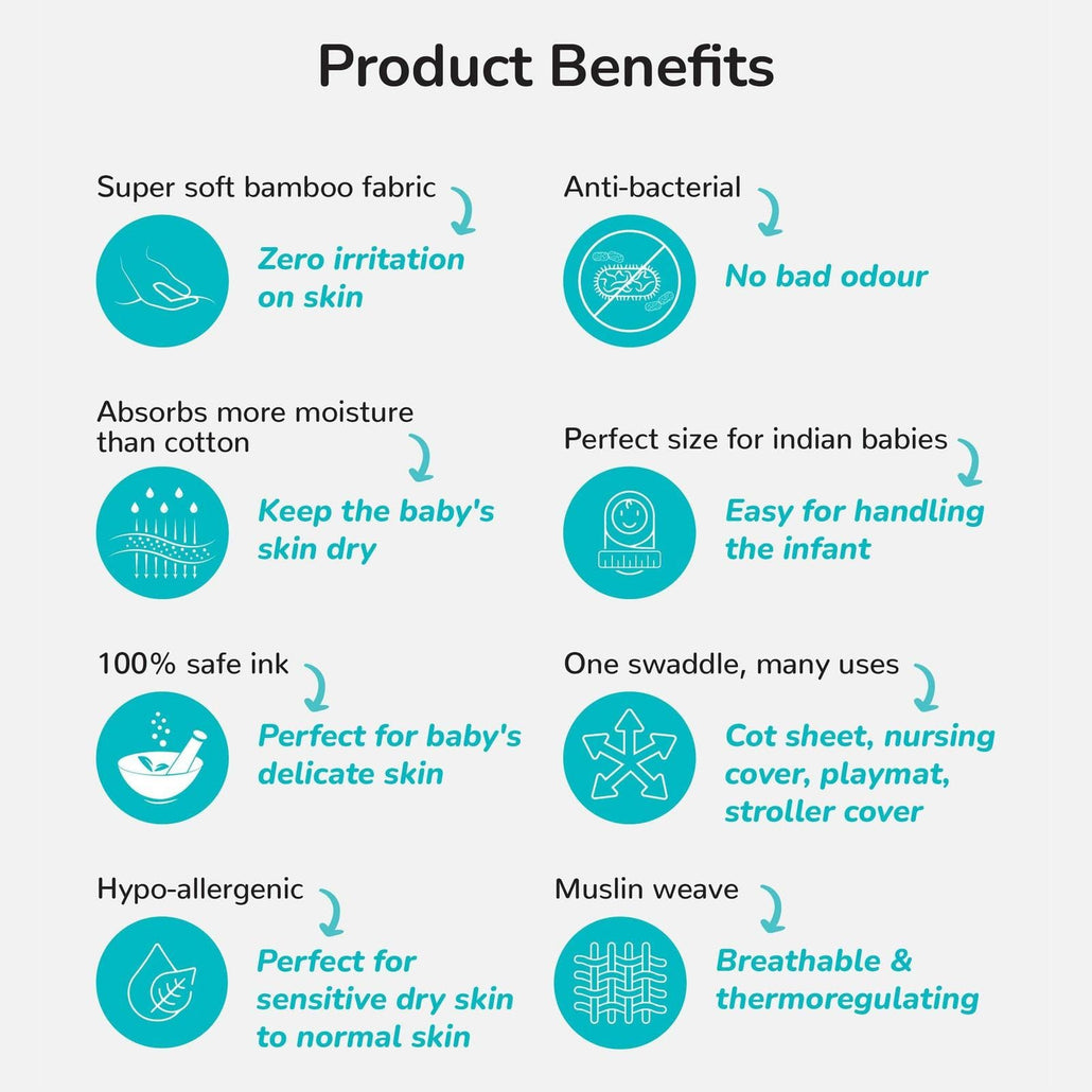- Size – just the right size of 90cm X 90cm for easy and secured swaddling