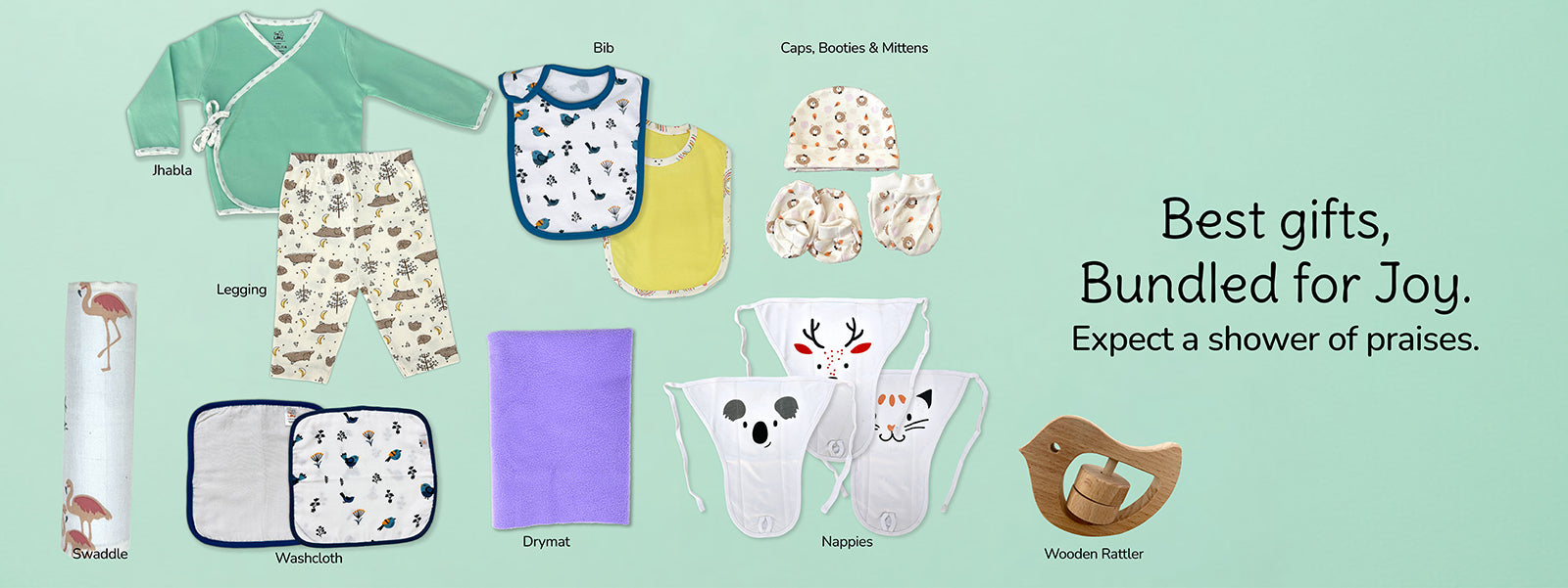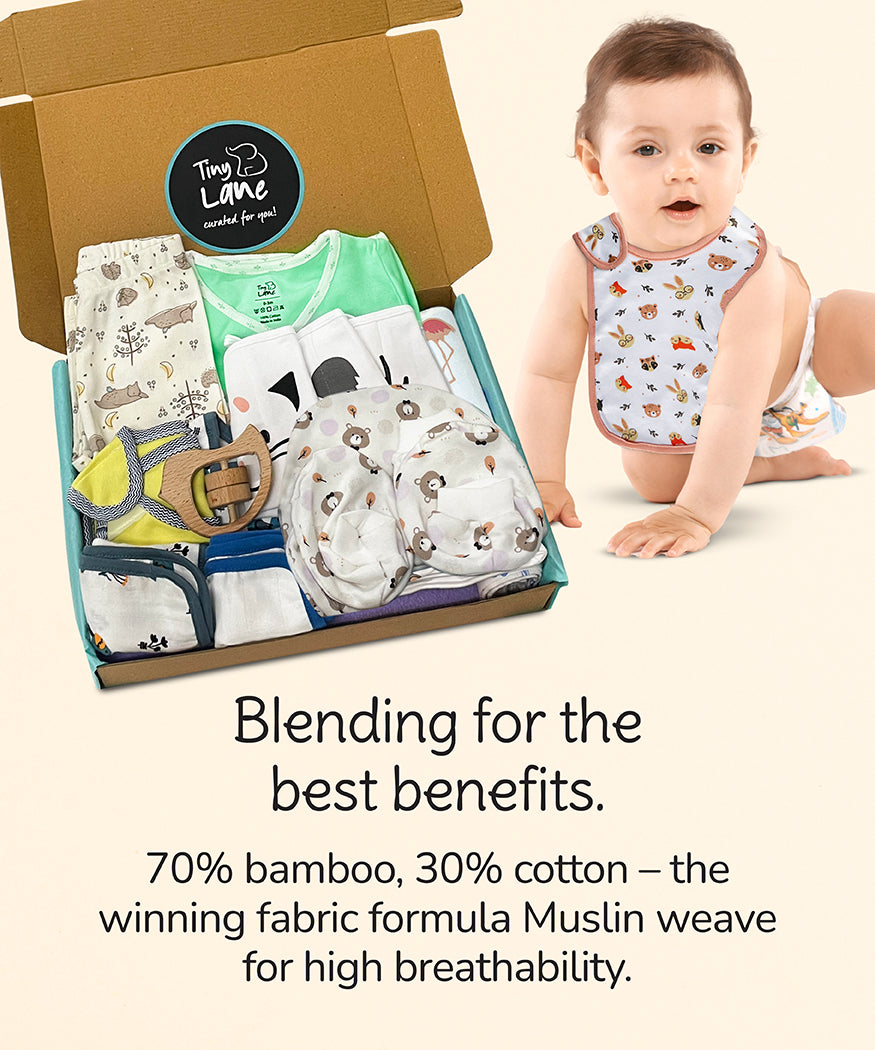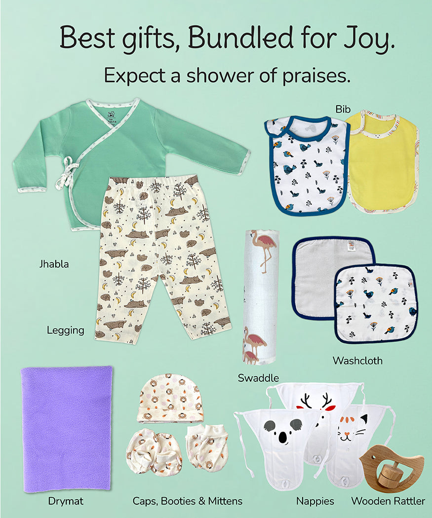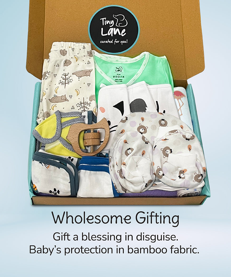 Shower your little one with love and essentials with Tiny Lane's JUMBO GIFT PACK, a treasure trove of 15 must-have baby goodies!