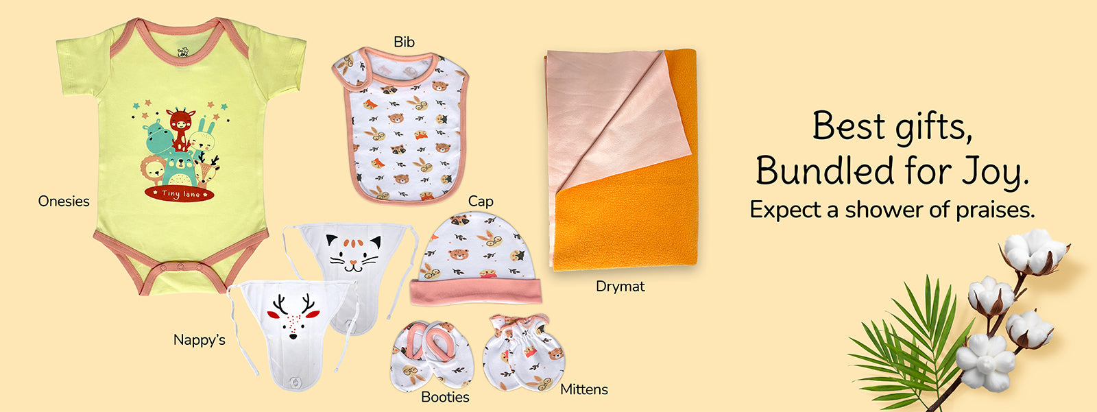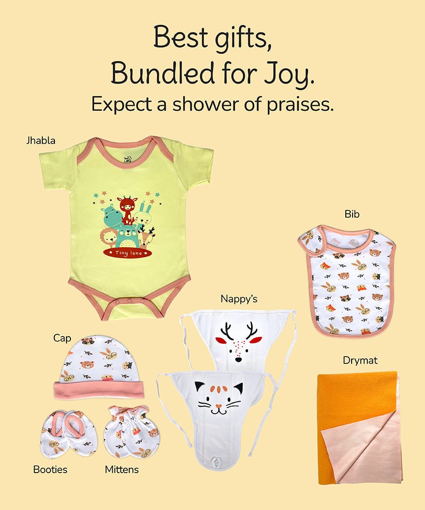 Neonatal Essentials - (set of 7) - variant - 3| Onesie - Jolly ride + 2 Nappy +1 Animal face CBM +1 Animal face bib+ Orange Dry mat
