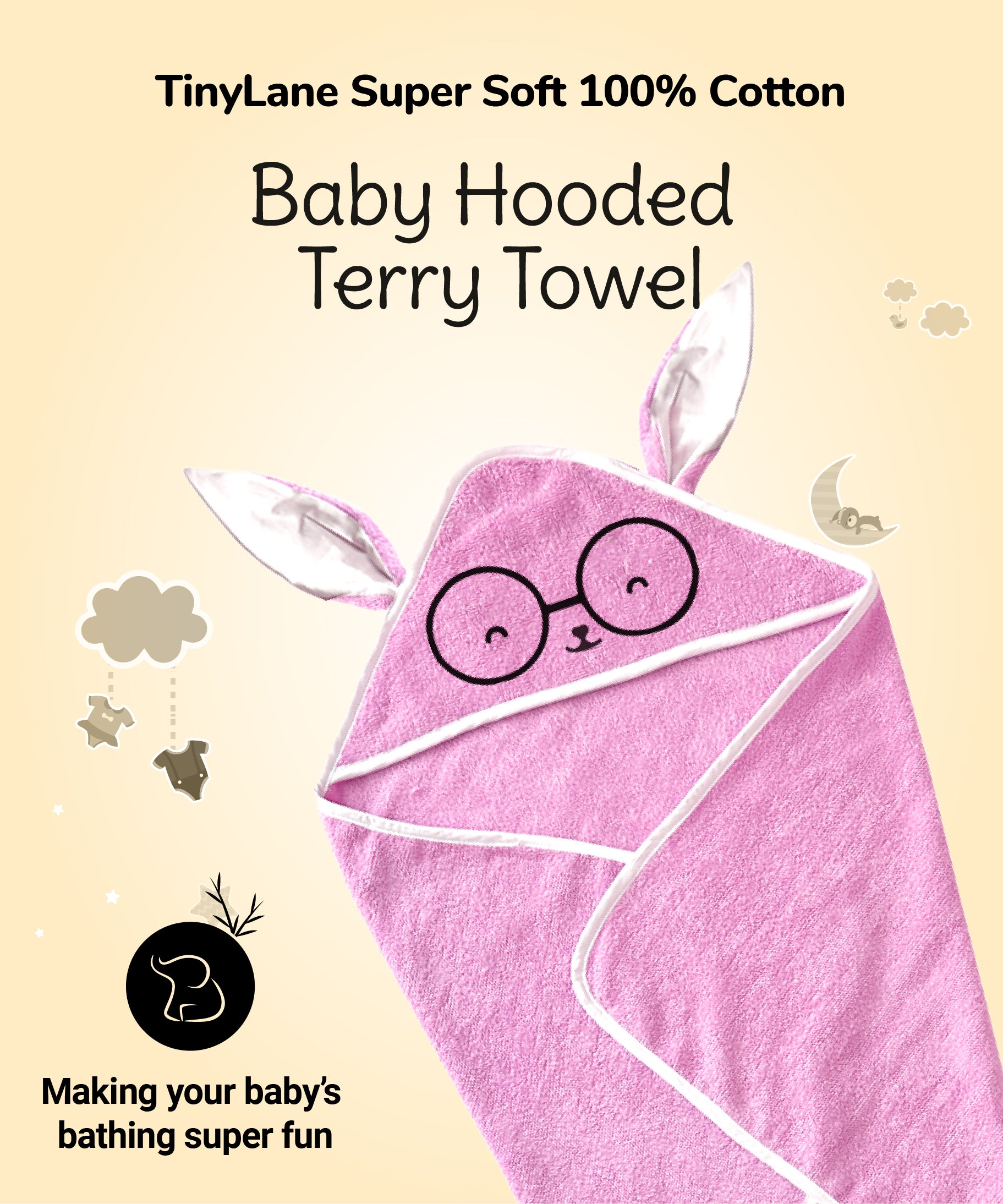 Tinylane 100% Cotton Terry Baby Hooded Towel for New Born, Super Soft Highly Absorbent, Size - 68 x 68cm, 0-2 Years (Pink Mauve)